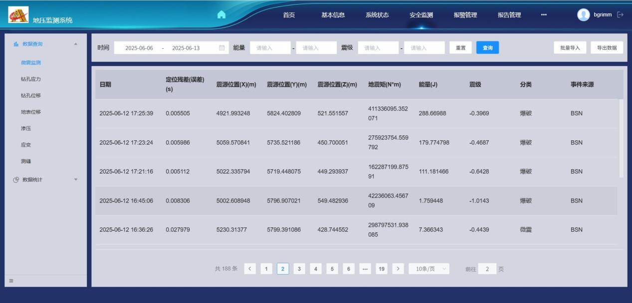 地压安全监测预警云服务平台针对地压监测数据处理、分析及预警的时效性差等难题,实现了微震监测数据自动识别、处理,并根据矿山实际情况建立预警模型,实现了系统状态查询及统计、三维实时数据展示、地压灾害风险实时预警及报警信息推送、监测数据查询及统计等功能。可兼容微震、应力、位移等多源监测数据融合显示、综合分析,大幅提高了监测数据的自动识别正确率、定位精度、预警的准确性和及时性,为矿山安全生产提供了技术支撑。