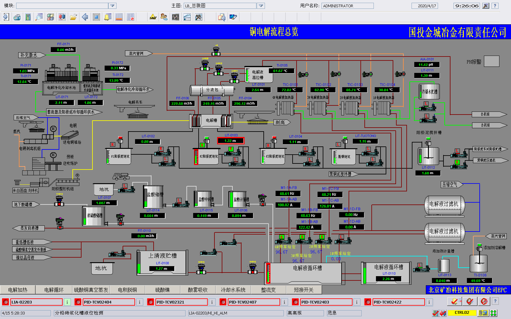 由MKSPORTS总承包的湿法电解区域EPC工程总承包位于河南省灵宝市豫灵镇,生产流程为火法冶炼产出的粗铜,经过电解精炼产出精铜,阳极泥湿法综合回收贵金属。该工程包括电解车间和阳极泥处理车间,两车间相互独立,各设置一套DCS控制系统,均采用冗余控制器+工程师站+操作员站的架构,通过环网联通整个系统。采集的实时生产数据集中归档,并设置一台OPC客户端用于和全厂生产信息管理系统联网,实现全厂资源统一管理。DCS系统针对电解车间电解液加热调节阀频繁,设计带蒸汽压力前馈的PID温度调节,针对添加剂槽蒸汽大,重新设计仪表测量系统,稳定投料速度,减少表面凸瘤和粒子的产生。集成阳极整型机组、天车定位、电解槽短接开关系统、电解液循环过滤系统、阴极剥离机组、残极洗涤机组、真空蒸发机组等子系统,集中显示调配关联数据,方便工艺监控生产过程。